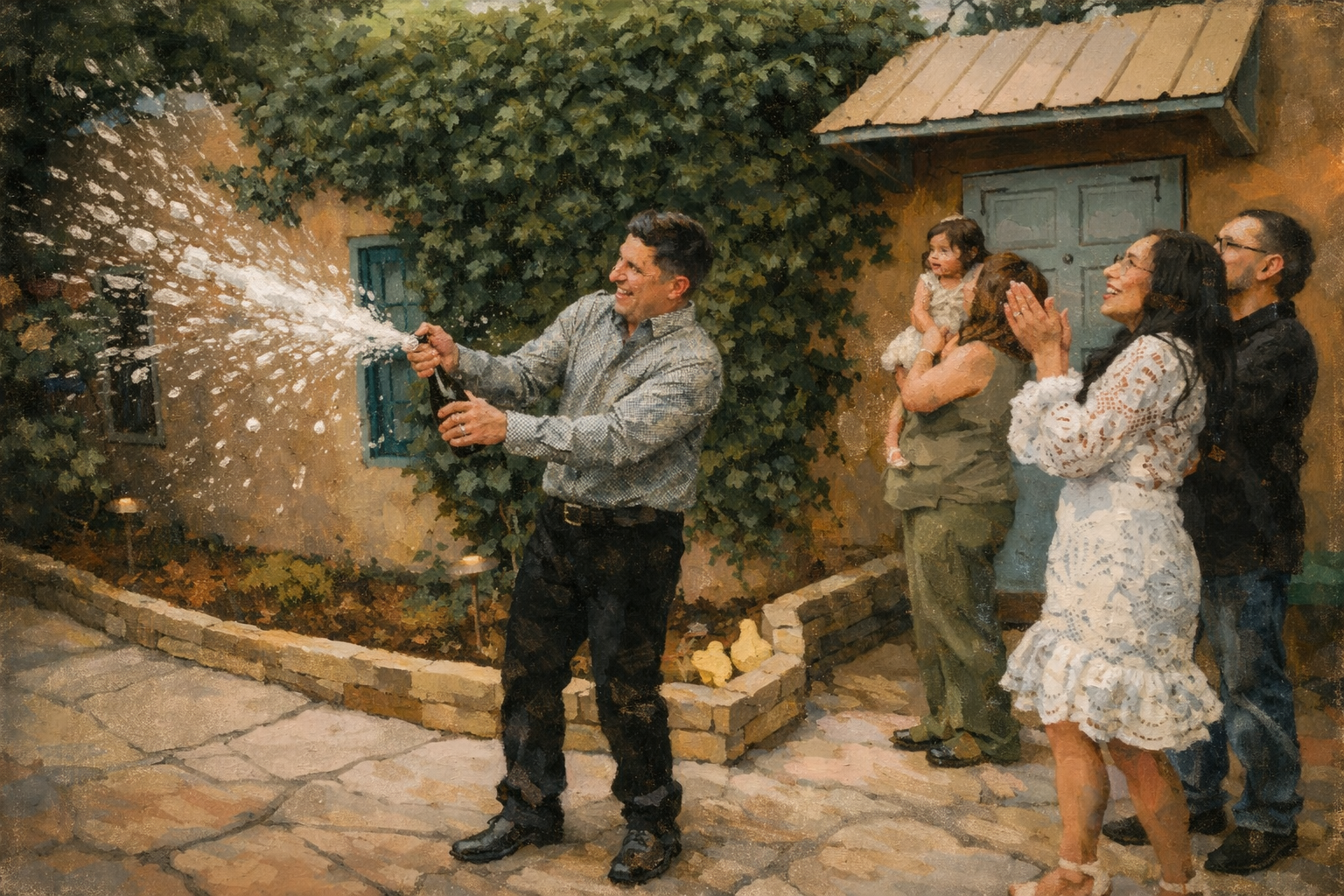 We said our vows, we kissed, everyone cheered. My husband opened the champagne and it sprayed so high into the air, we laughed like children and watched the cork fly high. We said cheers. The photographer kept capturing every second, even the champagne mist hanging in the sunlight.